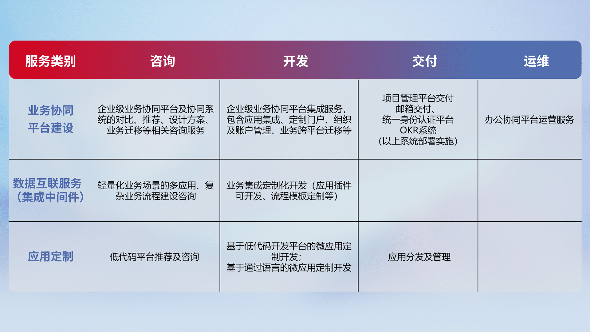 针对钉钉、、、、企微、、、、IDaas等平台级产品提供产品的规划、、、、方案、、交付、、定制化开发等服务,,实现如统一协同办公、、、、智能客户服务、、、混合会议管理、、智能数据查询、、等业务场景,,实现数字化转型。。
